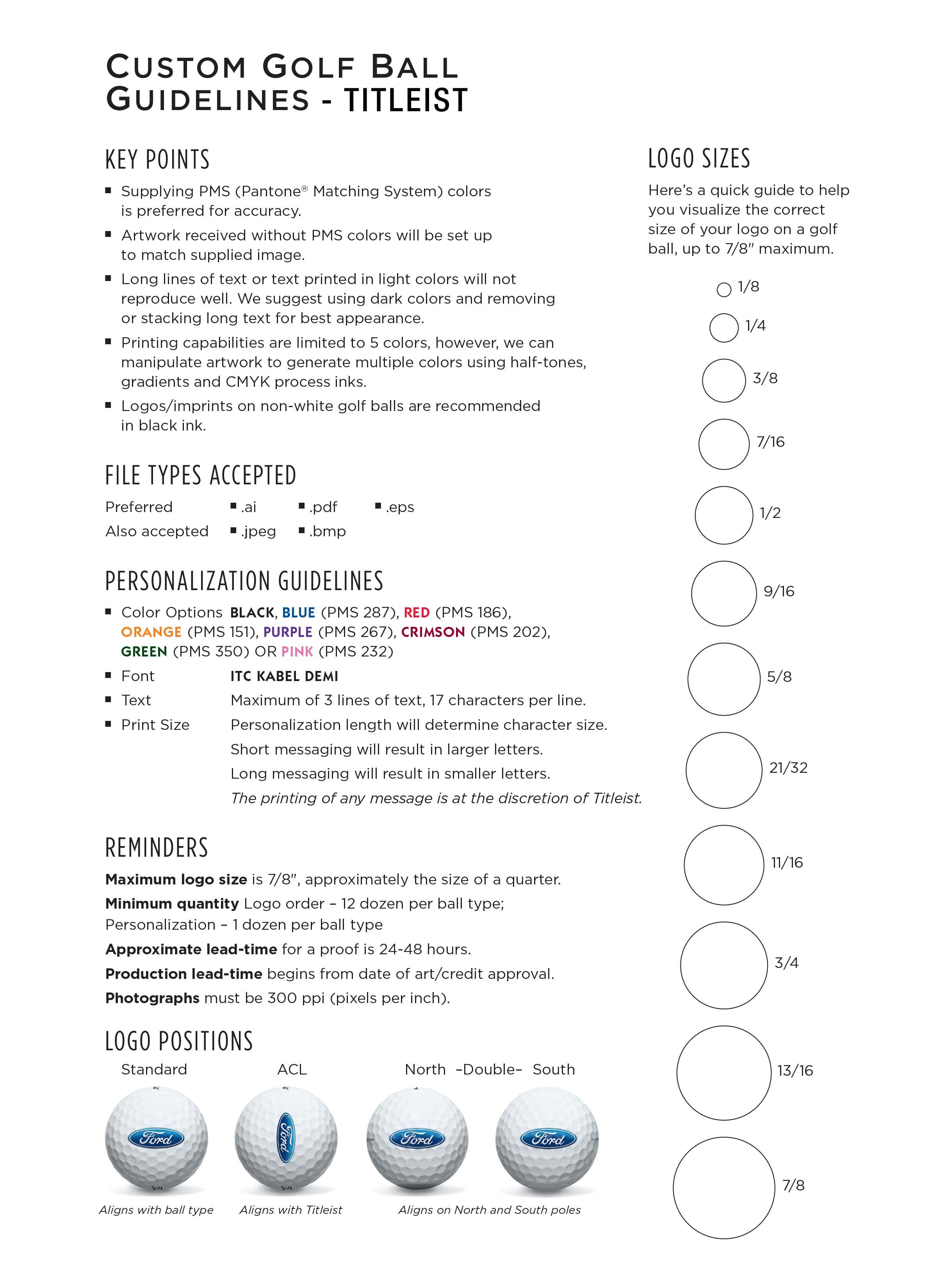 Imprint Location, Size: The location of an imprint on a golf ball is different depending on the service you are requesting. Standard imprint area of 7/8” will be used on most logos unless specified for smaller imprint or if logo does not look proper at maximum size, we reserve the right to resize for best appearance.